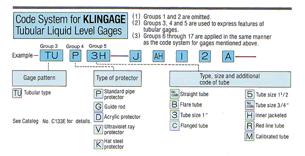 Tubular glass or resin forms a liquid chamber between upper and lower gage valves. It is the most simple and inexpensive liquid level gage which can be used under normal or relatively low pressures.