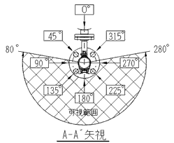 接続口径1B以下の場合、取付長さ=可視長さの場合、80°方向から、280°方向まで、自由に設定可能です。